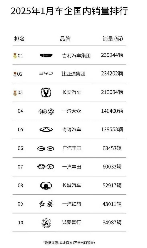 而这其实也是吉利1月能反超比亚迪的一个直接原因,去年12月,比亚迪销量超过了50万辆,今年1月整体销量就只剩30多万,国内销量只剩23万多了。