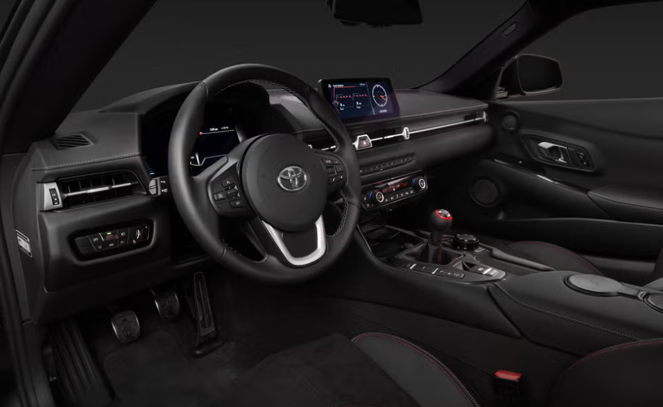 A90 最终版搭载一台源自宝马、最大功率 429 马力的 3.0 升涡轮增压直列六缸发动机,而美国版车型则沿用标准功率发动机,最大功率 382 马力,峰值扭矩 499 牛・米。动力通过八速自动变速箱或六速手动变速箱传递至后轮。无论选择哪种变速箱,每一辆 MkV 最终版都配备碳纤维鸭尾扰流板、加高的前轮胎扰流板,以及前轮拱上的导流板。如果想让自己的 MkV 最终版更加与众不同,丰田还提供 GT4 外观套件。该套件的设计灵感源自品牌的 GR Supra GT4 EVO2 赛车,包含独特的车身侧面拉花、红色后视镜外壳、哑光涂装的后扰流板,车尾的 Supra 标识也采用哑光黑色设计。选择 GT4 外观套件,还能额外付费选择两种专属哑光车漆颜色:“Burnout” 和 “Undercover”。不过丰田表示,GT4 外观套件要到今年秋季才能开始接受订购。为了让 Supra 在赛道或蜿蜒的乡间小路上操控更加精准,丰田对后差速器的控制软件进行了优化,以提升抓地力、减少转向不足。此外,车辆的转向手感变得更加直接,四个轮胎的外倾角也经过重新调整,进一步增强过弯时的抓地力。其他底盘悬挂方面的升级还包括更坚固的橡胶衬套、升级后的前防倾杆,以及重新调校的自适应减震器。丰田还新增了一个底盘加强件,提升车身刚性。即使在过弯速度过快,或者在快速接近前车时因分神看手机,升级后的布雷博刹车系统也能及时救场。内饰方面,Supra 最终版配备了皮质与翻毛皮拼接座椅,红色缝线和头枕上的 GR 标识让座椅更加精致。换挡杆带有红色装饰,就连安全带也是红色的,整体氛围感拉满。