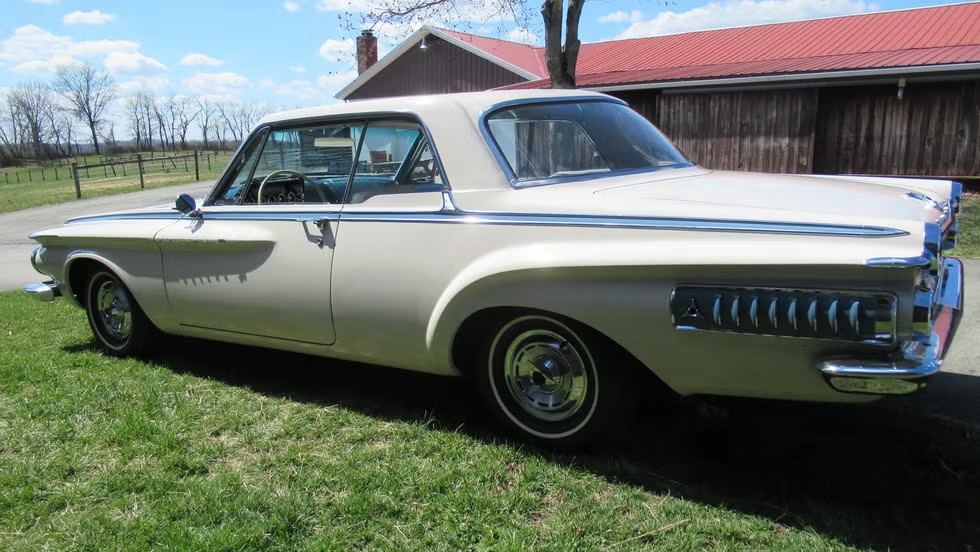 这辆明亮的白色汽车,是一辆 1962 年的道奇波拉拉 500,搭载 V8 发动机,排量 5.9 升配备三速自动变速箱。里程数仅为约 15800 公里,车身外观是贝壳米色,乙烯基内饰则是米色和蓝色的搭配。