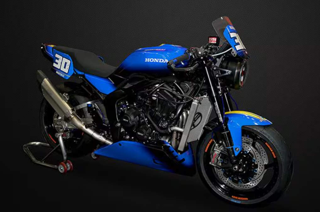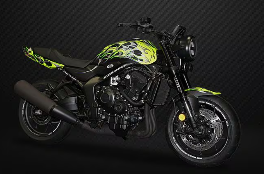 CB1000F 概念车直接沿用了 CB1000 黄蜂的整套底盘和动力系统,这意味着它采用钢制双梁车架、双侧摇臂,搭载一台最大功率 150 马力的发动机,该发动机源自 2017 款 CBR1000RR “火刃”。车身尺寸和悬挂系统也与黄蜂一致,包括昭和 SFF – BP 倒立式前叉和可调式单后减震。可以说,CB1000F 基本已经是一台可以直接量产的车型。事实上,它离量产已经非常近,在大阪摩托车展上,本田不仅展示了标准版 CB1000F,还展出了两款改装版本:一款是蓝色的森协版,灵感来自森协的老式耐力赛车,配备加强型锻造铝制摇臂和超大散热器;另一款是与日本时尚品牌 Beams 合作打造的 “Guccimaze” 版,涂装十分吸睛。