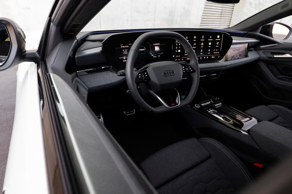 和外观一样,A6 e-tron 的内饰也没有以往奥迪车型那种惊艳感。过去,奥迪车型在设计和用料上通常领先同级,但这款 A6 e-tron 内饰最吸引人的,是质感上乘、类似羊毛材质的内饰,覆盖了中央扶手、门板和仪表台。车内也有一些亮眼设计,比如挡风玻璃底部的发光条,它不仅是氛围灯,还能在转向时闪烁绿色灯光。标配的玻璃车顶分为多个区域,每个区域都能独立调节透明度。数字仪表盘和中控娱乐屏集成在一块弧形屏幕中,还可选装副驾驶前方的小屏幕。尽管车顶线条倾斜,但后排空间足够,身高 1.83 米的乘客也不会觉得头部空间局促,膝部空间也很充裕。不过,由于地板较高,坐姿会显得比较 “蜷缩”。PPE 平台还让车辆拥有一个小型前备箱。打开后备箱,储物空间十分宽敞,后排座椅还能放倒进一步扩展空间。