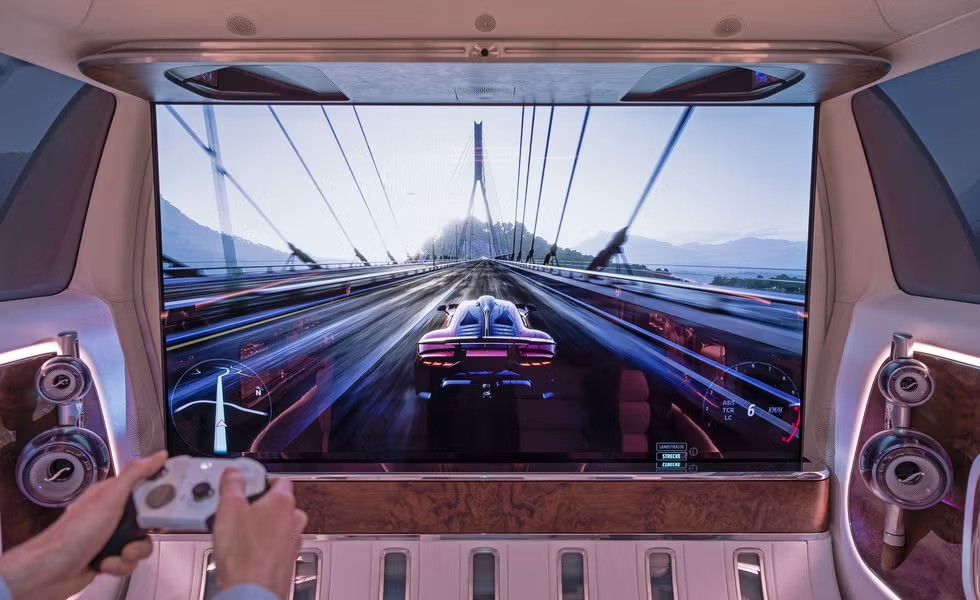 Vision V 的设计初衷是让人乘坐而非驾驶,当一块巨大的 65 英寸可伸缩 4K 屏幕从隔板前的地板缓缓升起时,这一设计意图便展露无遗。透明的地板条让乘客在进入车内后能看到屏幕缓缓升起。隐藏在车顶内衬和地板中的七个投影仪,再加上可像隔板一样变为不透明的侧窗,可作为额外的投影面,为乘客带来 360 度的沉浸式视觉体验。奔驰为信息娱乐系统和这块超大屏幕打造了一系列 “数字环境”,本质上就是不同的娱乐模式。“娱乐” 模式专注于播放音视频内容;“放松” 模式会放倒座椅,展示舒缓的风景画面并播放轻柔背景音乐;“工作” 模式则支持视频通话,还提供其他办公相关工具。