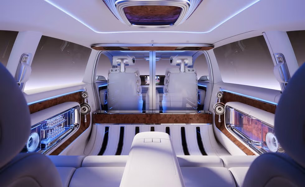 在过去二十年里,许多概念车都主打 “休闲客厅风格” 的内饰,而 Vision V 堪称这一风格的完美典范。巨大的侧滑门打开时,与之配合的发光可伸缩踏板也会同步出现,展露出宽敞的座舱。座舱内装饰着高档的木质饰板、白色纳帕皮革和白色丝绸。座舱两侧各有一个由抛光铝框包裹的玻璃橱柜。Vision V 配备了一套 42 扬声器的杜比全景声环绕音响系统,其中四个扬声器安置在从车厢各壁伸出的精致玻璃外壳中,这些外壳安装在支柱上。座椅之间的中控台设有用于控制信息娱乐系统的触摸板和一个可折叠桌板,如同飞机头等舱座椅的配置。同样,后排座椅由一系列可灵活调节的管状靠垫组成,能够完全放平形成一张床。桌板还可延伸变成棋盘,漂亮的玻璃棋子收纳在一侧的橱柜中。后排乘客区与驾驶区之间的玻璃隔板可实现完全或部分的透明与不透明切换。