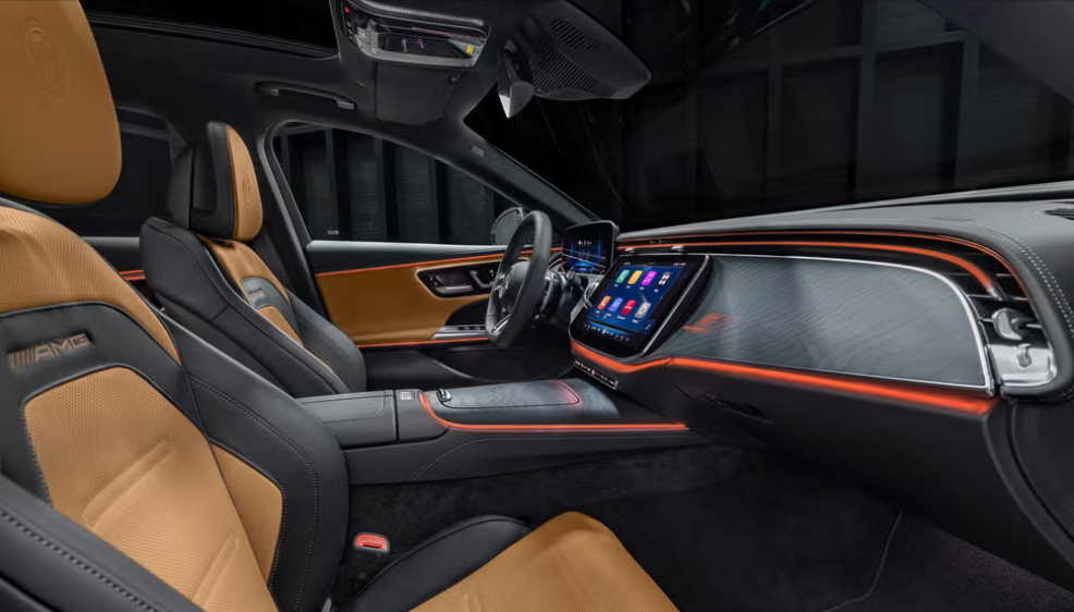 电动机自身可产生 161 马力,它集成在九速变速箱的外壳内。一个 400 伏、21 千瓦时的电池位于旅行车后部后备箱地板下方,这可能会使后备箱载货空间相比标准 E 级旅行车有所减少。虽然奔驰没有公布这款旅行车的纯电续航里程,但轿车版车型的纯电续航里程为 68 公里。能将功率提升 27 马力的 “竞赛起步” 系统,是 AMG 动态增强套件的一部分。该套件还将车辆最高时速从 249 公里 / 小时提升至 280 公里 / 小时。套件中还配备了主动式发动机悬置、电子控制限滑后差速器,以及带有红色卡钳和 391 毫米前刹车盘的 AMG 复合刹车系统。车内,该套件增加了一个采用纳帕真皮和微纤维材质包裹的 AMG 高性能方向盘。E53 旅行车将提供 12 种车漆颜色,还有可选的外观碳纤维套件。标准的 20 英寸五辐轮毂可以替换为 20 英寸十辐轮毂或 21 英寸轮毂。车内座椅可选用多种微纤维和皮革内饰材质,标配 17 扬声器的柏林之声环绕音响系统。副驾驶前方配备 12.3 英寸显示屏的超联屏为选装配置。