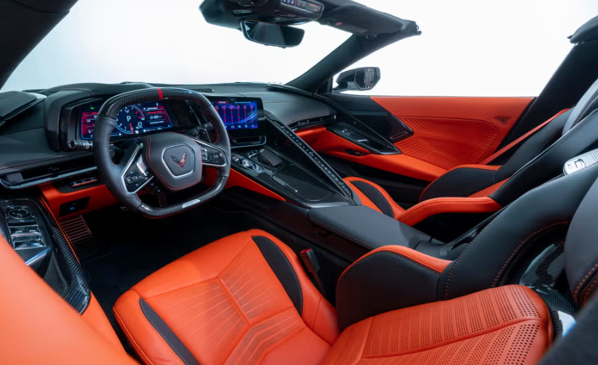 进入车内,ZR1 的内饰与其他科尔维特车型有很多相似之处。同样是偏向驾驶员一侧的布局,那排颇具争议的实体按键依然将驾驶位和副驾驶位隔开。车内的数字化显示屏包括 12.0 英寸的仪表盘和 8.0 英寸的触摸屏。对于喜欢高尔夫的人来说,一个好消息是,ZR1 后舱盖下的储物空间与其他科尔维特车型一样大,意味着可以放下两个高尔夫球包。ZR1 还有独特的内饰徽章和标识,并且配备了增压压力表。如果选择更高配置的 3LZ 版本,车门上会有独特的缝线设计,增添了更多精致感。车内内饰还可以选择热情的哈瓦那橙配色方案,并且提供蓝色缝线供消费者选择。