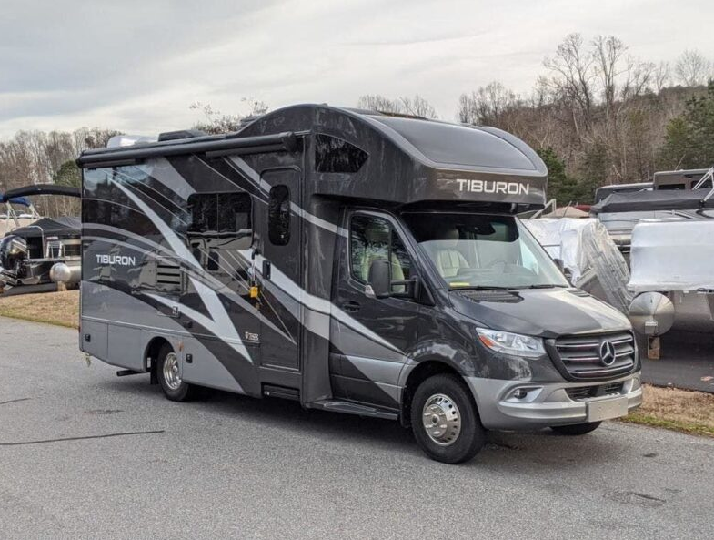 托尔蒂伯龙 24TT:一款紧凑又宽敞的 C 型房车。拓展舱内有一张 193 厘米长的梦幻餐桌、衣柜,还有一张 152×190 厘米可翻折的 queen 床,并配有隐私帘,餐桌也可换成影院座椅。旋转驾驶座提供额外座位,还配有专属咖啡桌。入门上方和睡眠区各有一台电视。厨房配备冰箱、双灶燃气灶、带空气炸锅功能的对流微波炉。车尾角落是带 76×81 厘米淋浴间的完整卫浴间。驾驶室上方的延伸部分设有床铺和天窗。