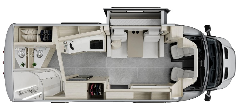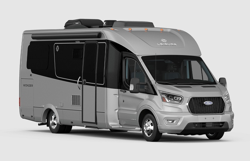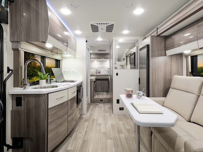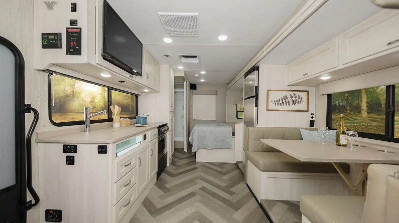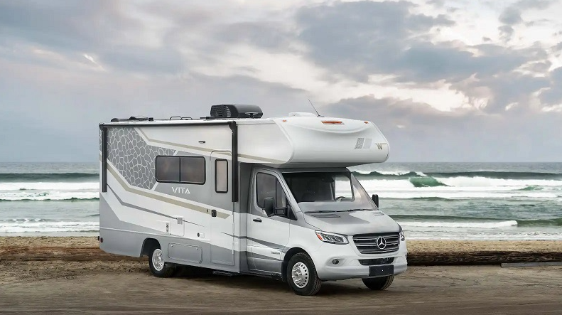 温尼贝戈 Vita 24P:温尼贝戈推出的带拓展舱小型房车。这款 C 型房车配置丰富,有大容量水箱、3.6 千瓦液化石油气发电机、两块 100 瓦太阳能板,还有自动四点调平系统。得益于拓展舱和巧妙布局,车内空间十分宽敞。驾驶室有旋转驾驶座,驾驶室上方有床铺。厨房配备三灶炉灶、对流微波炉、冰箱、双水槽,还有带安全带的餐桌,水槽上方也有电视。车尾睡眠区有 queen 床和两个床头柜,卫浴间带 76×81 厘米淋浴间,推拉折叠门设计最大化利用空间。