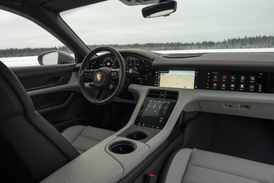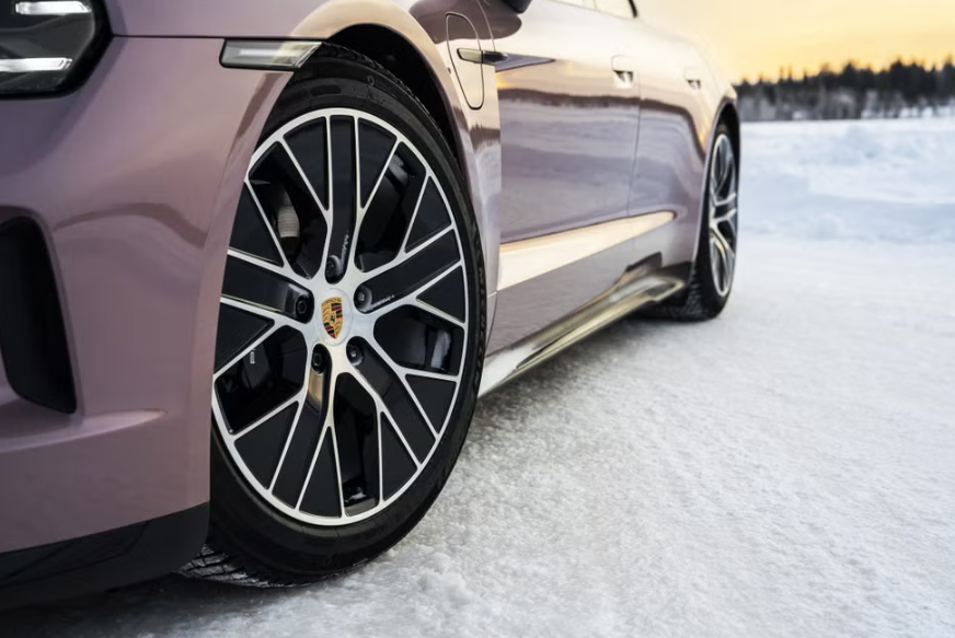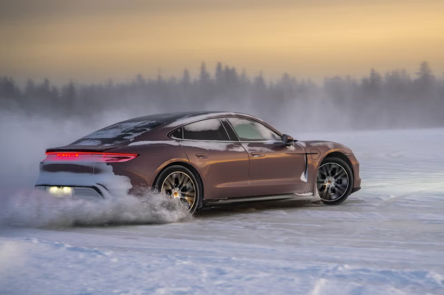 保时捷称 Taycan 4 加速到100公里 / 小时的时间比后轮驱动版快十分之一秒,但这是保守估计。最近测试的 2025 款后轮驱动 Taycan 加速到100 公里 / 小时用时 4.1 秒。如果能再缩短零点几秒,那就意味着这款相对最实惠的 Taycan 车型能在 4 秒内完成 0 至100 公里 / 小时的加速,但它不太可能达到2020 款 562 马力 Taycan 4S 的 3.4 秒的成绩。驾驶 Taycan 4 在冰面上让保时捷汽车施展 “斯堪的纳维亚式甩尾” 相当惊艳。车选装了包括 Taycan Turbo Aero 20 英寸轮毂和米其林 Pilot Alpin 5 冬季轮胎,这让 Taycan 4 在白雪皑皑的雪地上获得了惊人的抓地力。在低温下,驾驶着 Taycan 4 在保时捷的冰面蛇形赛道上低速滑行,穿过一个数字 “8” 字形赛道,还在一个漂移圆环上行驶。虽然这不是最全面的驾驶体验,但它确实突出了使 Taycan 成为我们开过的最佳电动汽车之一的特点。松开油门,转动方向盘,然后在蛇形赛道起点再次踩下油门,Taycan 就会进入滑行状态。当你驾驶着 Taycan 在锥形路标间左右摆动时,车身有大量的重量需要转移,但线性的转向助力让操控变得很轻松。即使在冰雪这样低附着力的路况下,通过反打方向盘和控制油门来保持壮观的滑行姿态,所需的精力也比想象中少得多。