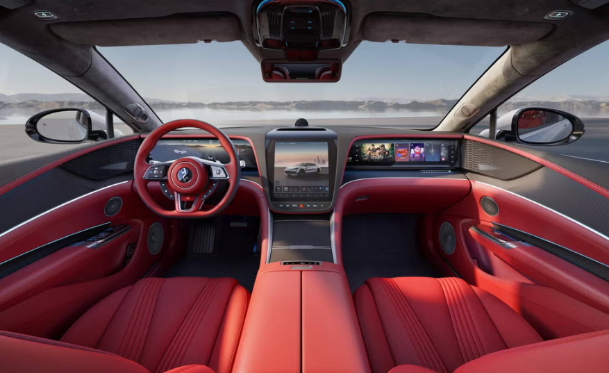 一块 135.5 千瓦时的电池可提供 719 公里的续航里程,不过这个数据是在较为乐观的 CLTC 测试循环下得出的,这块电池的最高充电功率可达 500 千瓦,仰望声称可以在不到 20 分钟的时间内将电量从 30% 充至 80%,不过考虑到其宣称的峰值充电功率,这个充电时间似乎比我们预期的要长一些。U7 还配备了其他出色的配置,比如后轮转向系统和 DiSus-Z 悬挂系统。与仰望其他车型所采用的 DiSus-P 系统(使用传统液压减震器)不同,DiSus-Z 系统采用了线性执行器。该系统不仅能提供极为平稳的驾乘体验,并且具备高度调节功能。如果车辆爆胎,它可以抬起爆胎的车轮,依靠另外三个车轮继续行驶,从而稳定车身。与此同时,“天眼” 驾驶辅助系统配备了三个激光雷达传感器、五个雷达传感器、13 个高清摄像头和 12 个超声波传感器。这些配置共同作用,实现了 L2 级别的脱手驾驶能力。车内采用了质感上乘的红色纳帕皮革,并且配备了三块屏幕,包括一块 12.8 英寸的中央显示屏、一块 23.6 英寸的数字仪表盘和一块为前排乘客准备的 6.0 英寸屏幕。U7 提供四座和五座两种布局,前排座椅支持 20 向调节,并具备通风、加热和按摩功能。后排乘客除了拥有两块 12.8 英寸的屏幕外,还配备了折叠桌和迷你冰箱,甚至还有 “温度感应” 扶手,让你不会感觉过热或过冷。此外,车内还配备了一套 23 扬声器的音响系统。