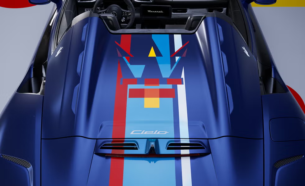作为这项新定制计划的概念验证,玛莎拉蒂推出了一款独一无二的 MC20 Cielo Less is More…? 车型。它采用了定制的喷漆工艺,以哑光蓝色(Blu Corse Matte)为底色,搭配由几何形状构成的光泽涂装,这些几何形状的设计灵感源自包豪斯(Bauhaus)艺术风格。这些几何形状采用了白色、蓝色、黄色和红色等色调。