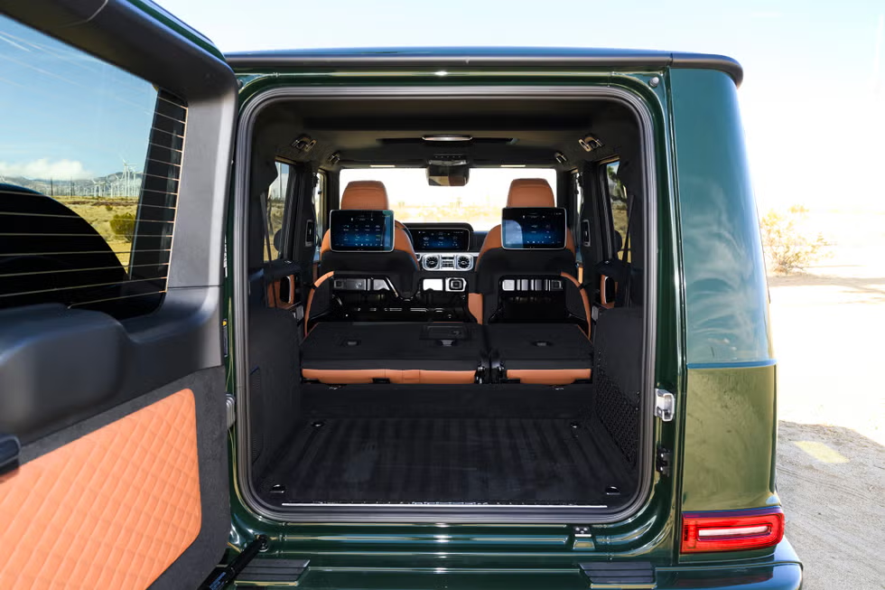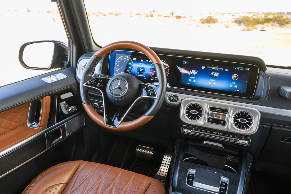 它确实非常舒适。打开车门就像打开一个装满贵重物品的保险箱,不仅有开门时那种真空释放的咔嗒声,而且当你坐进去时,迎接你的是浓郁的皮革和木材香气。我们的测试车采用了经典的配色组合,深林绿色的外观搭配温暖的马鞍棕色皮革内饰,内饰有绗缝面板和银色深色木质装饰。方向盘手感极佳,包裹的皮革柔软得近乎丝绸,布局比奔驰轿车的还要合理。尽管它采用了与其他车型相同的触摸感应控制,但不太容易误触。座椅位置高,如同王座一般,具备多种加热、通风和调节功能。我们有好几个朋友只是为了体验按摩功能就钻进车里,哪怕车根本不会开动。不过不能一次都进来,因为虽然前排座椅堪称皇室级别的享受,但后排座椅的腿部空间却小得惊人。如果再选装后排娱乐系统,后排就会变得相当不舒服。任何打算把 G550 当作家庭用车的人,在勾选这个选装选项前,最好先量好儿童安全座椅的尺寸。