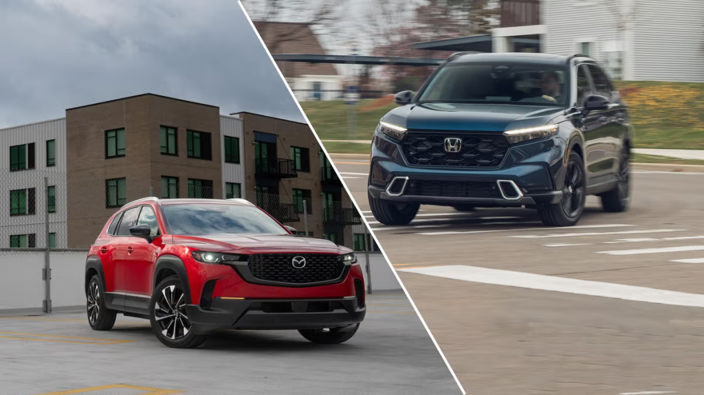 本田 CR – V 和马自达 CX – 50 堪称紧凑型 SUV 中的佼佼者。去年春天,马自达 CX – 50 凭借非混动动力系统,在一场小型 SUV 混战中击败了七个竞争对手。而本田 CR – V 全系车型今年荣获了 “10 佳卡车” 奖项。鉴于公众对混合动力汽车的兴趣日益浓厚,我们很好奇这两款车的混动版本相互较量会有怎样的结果。在本田这边,混动动力系统是 CR – V 在基础款涡轮增压 1.5 升四缸发动机之上的进阶之选,因此仅用于顶配的三个配置级别:Sport、Sport L 和 Sport Touring。我们测试的车辆是 Sport Touring 版,配备全轮驱动(在较低配置中为选装)马自达方面,CX – 50 的混动动力系统实际上处于中间定位,介于自然吸气的基础四缸发动机和动力更强的涡轮增压四缸发动机之间。马自达 CX – 50 混动版有三个配置级别:Preferred、Premium 和 Premium Plus。同样,我们测试的是顶配的 Premium Plus 版。所有 CX – 50 车型均标配全轮驱动。