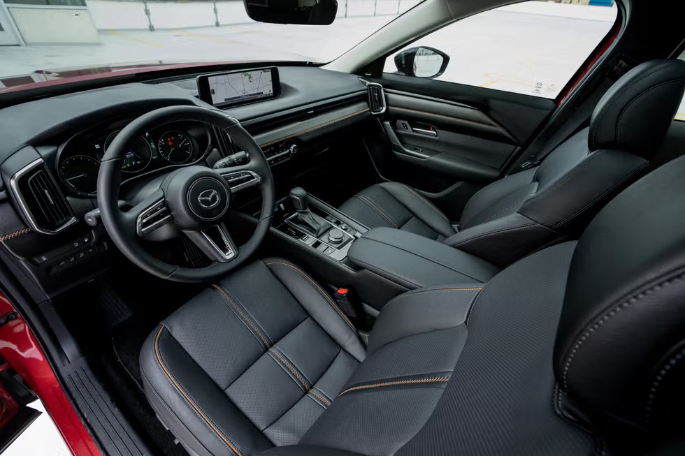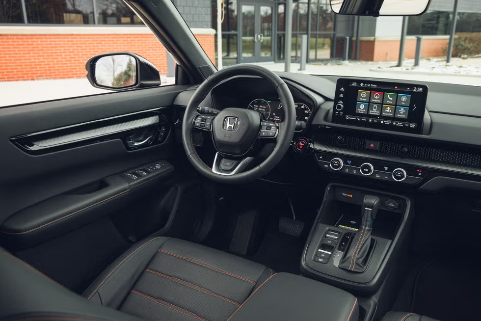 最新款 CR – V 相较于前代车型,外观更显大气方正。不过,如果你想要一辆 CR – V 混动版,那你最好喜欢黑色轮毂和黑色装饰,因为这是其标配。我们喜欢 CX – 50 更偏向旅行车的比例,它有着较长的发动机罩和靠后的座舱,看起来就像是 CX – 70/CX – 90 的缩小版。坐进车内,CR – V 在视野方面表现出色,获得了高分。其控制装置和开关的布局具有典型的本田风格:简单直接、易于操作,没有任何花哨的设计。我们很喜欢用于控制空调的三个旋钮以及实体换挡杆。车内的储物空间也很充足。前排厚实的座椅十分舒适,后排空间也很宽敞。然而,除了仪表盘上的六边形图案装饰外,车内整体风格较为平淡,即便在这款顶配车型中,内饰材料也并无特别之处。顶配版 CX – 50 的内饰散发着一丝奢华气息,仪表盘和门板上采用了柔软的皮革装饰。和 CR – V 一样,它也配备了真正的换挡杆以及实体的空调控制按钮和旋钮,值得称赞。马自达的后排座椅腿部空间和膝盖空间也很充裕,但坐垫没有本田的厚实。而且 CX – 50 更低矮的车顶线条意味着其视野没有那么开阔。本田的信息娱乐系统较为普通,但这也无妨。9.0 英寸的触摸屏虽远非市面上最大的,但也足够大了。屏幕上有一个音量旋钮和两个用于调节的小按钮。在 Sport Touring版本中,智能手机镜像功能是无线的,顶配车型还配备了无线充电板。