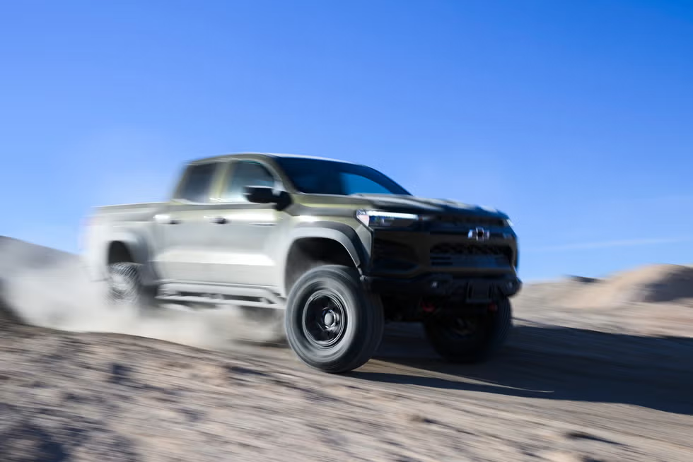 在越野中型皮卡领域,尤其是在沙漠附近,塔科马占据着主导地位。我们这次对比测试就在这里进行,停车场和加油站里有太多塔科马了,我们每次都得仔细确认是不是自己的车。我们测试的塔科马很显眼,车身有多处 TRD Pro 标识,还采用了 2024 款 TRD Pro 专属的 Terra 橙色车漆。2025 款车型新增了一种迷人的帆布棕色,官方称之为 “泥浴色”。除了新颜色选项和红色前拖钩外,2025 款 TRD Pro 和之前的车型没有变化,这也说得通,毕竟 2024 款塔科马进行了大规模重新设计。TRD Pro 只有双排座、五英尺货厢的配置,雪佛兰和福特参与测试的车型也是如此。在 约 83.82 厘米的固特异牧马人 Territory RT 轮胎和宽大的轮拱后面,是带有后外置储液罐的福克斯 QS3 三档手动可调减震器、锻造铝制上控制臂、电子锁止后差速器、多地形和爬行控制驾驶模式,以及电子防侧倾杆断开装置。TRD Pro 的其他优势还包括一个 约 50.8 厘米的 LED 灯条、Rigid Industries 的双色 LED 雾灯、ARB 钢制后保险杠,以及丰田的 IsoDynamic 前座椅,这种座椅有自己的气动减震器,能吸收福克斯减震器没过滤掉的路面颠簸。TRD Pro 搭载了塔科马最强的动力系统 ——i – Force Max 混合动力,它将一台涡轮增压 2.4 升四缸发动机与一台夹在发动机缸体和八速变速器之间的 48 马力电动机相结合,总输出功率为 326 马力,扭矩为 630 牛・米。
