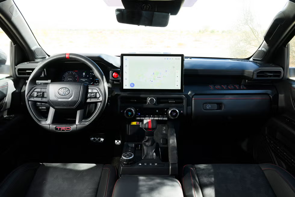 Ranger Raptor 配备了一个 12.4 英寸的触摸屏,由于是竖屏设计,看起来更大。控制按钮有点分散,有些在屏幕里,有些在控制台上。虽然布局不是最合理的,但很容易找到越野模式、基本的空调和信息娱乐设置。储物方面,它有两个手套箱,中控台还有很多小槽和储物格。福特的座椅最亮眼,红黑配色,看起来就像有人从 MotoGP 车队偷了皮革,然后做成了座椅套。前排座椅的支撑性不是最好的,坐垫中间感觉有点空,但后排空间比丰田宽敞,虽然没有 ZR2 Bison 那么舒适。