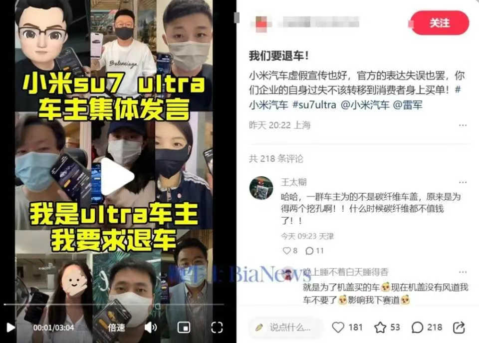 如今,中国多地车主自发组建了维权群,300 余名车主联合录制视频,坚定地要求无损退车。更有车主委托律师启动集体诉讼程序,依据《中华人民共和国消费者权益保护法》第五十五条主张退一赔三。在一位要求退车的车主看来,不管是小米汽车虚假宣传,还是表达失误,企业都应该为此买单,而不是将自身过失转嫁给消费者。