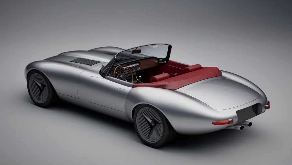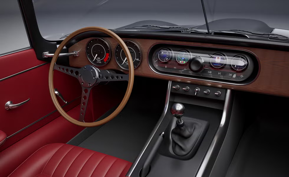 座舱延续 “少即是多” 的理念:仪表盘采用隐藏式数字显示屏,但保留圆形机械指针;实体拨杆开关取代触控按键,复古质感扑面而来。最令人惊喜的是金属材质的五速手动挡把 —— 在电动车泛滥的时代,这种纯粹的机械交互显得尤为珍贵。座椅采用深棕真皮包裹,搭配 alcantara 材质车顶,既符合现代豪华审美,又延续了 60 年代的优雅氛围。车尾双出排气管明确传递出设计团队的态度:这不是一台寂静的电动车,而是一台能唤醒感官的燃油跑车。尽管官方未透露具体动力配置,但考虑到原版 E-Type 的直列六缸与 V12 发动机布局,复刻版大概率会沿用经典动力。轰鸣的排气声浪、手动换挡的节奏感,正是对那个燃油黄金时代的最佳致敬。