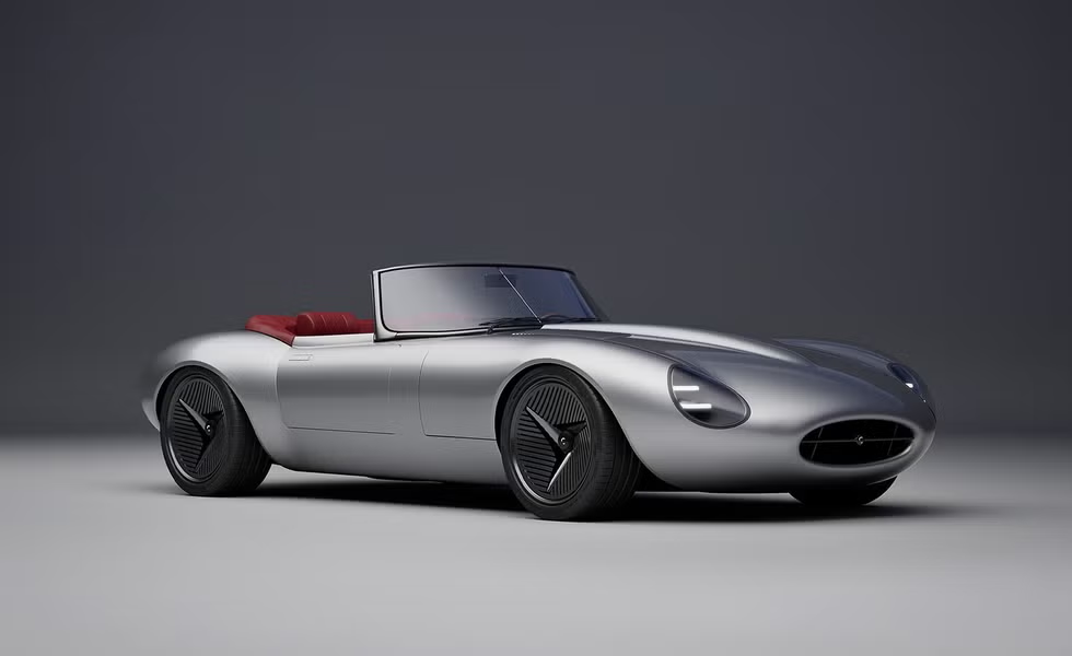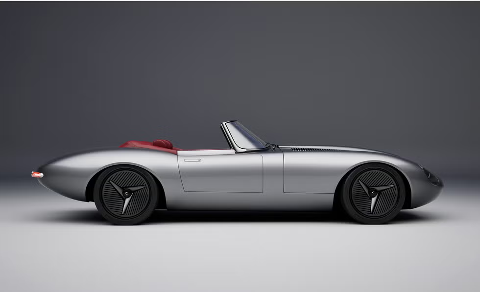 概念车外观采用哑光灰涂装,摒弃了原版的镀铬饰条,以极简线条勾勒出更具雕塑感的车身。前大灯与尾灯经过重新设计,现代 LED 光源取代了原版昏暗的 Lucas 灯具,既保留椭圆灯组的轮廓,又赋予科技感。大尺寸轮毂灵感源自原版钢丝轮圈与三叶片锁止轮毂盖,造型前卫却完美传承复古神韵。车身姿态低矮,宛如蓄势待发的猎豹,经典的长车头、短车尾比例丝毫未变。