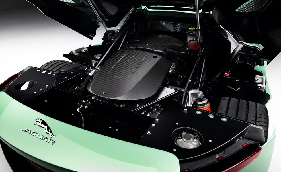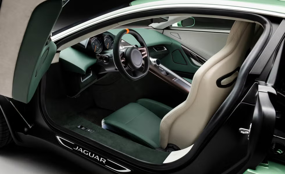 沿用捷豹 F-Type 的 5.0 升机械增压 V8 发动机,但舍弃电影中粗糙的序列式变速箱,换装七速双离合变速箱,动力直驱后轮。日常模式:注重平顺性,变速箱换挡逻辑偏向经济性,排气阀门关闭时声浪克制。运动模式:换挡速度提升 30%,油门响应更灵敏,排气系统全开释放 V8 的雄浑轰鸣,配合主动空气动力学套件,高速稳定性与制动效率显著提升。实用配置:新增液压前轴举升系统,通过减速带时可提升底盘高度,避免昂贵前唇损伤。原版特技车的内饰仅有最基础的功能性部件,而改造后的 C-X75 堪称 “奢华实验室”:深绿真皮与米白色翻毛皮拼接,中控台采用悬浮式拉丝铝饰板,三枚带触控屏的旋钮向驾驶员倾斜,操作便利性与视觉层次感兼具。无线充电板、Apple CarPlay、全液晶仪表、数字后视镜一应俱全,车顶控制区集成启动按键与驾驶模式切换,方向盘由整块铝坯铣削而成,握感扎实。定制音响系统与车身隔音优化,即便在赛道模式下,座舱内对话清晰度仍优于多数超跑。