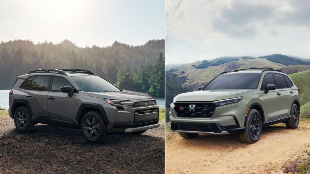 外观方面,换代后的 RAV4 延续个性风格,并细分为 Core、Rugged 和 Sport 三大造型系列。其中,Sport 系列新增仅提供插电混动的 GR Sport 版本,同时包含 SE 和 XSE 配置;Core 系列涵盖 LE、XLE 和 Limited;Rugged 系列则以越野取向的 Woodland 版本为主,标配四驱、全地形轮胎和更高离地间隙,车身尺寸也在全系中最大,长宽高分别为 4618mm、1722mm、1880mm。相比之下,本田 CR-V 混动版车身稍长(4694mm)、稍矮(1692mm)、稍窄(1864mm),轴距也更长(2690mm) 。为对标 RAV4 越野款,CR-V 首次推出 TrailSport 版本,同样配备全地形轮胎,但全系不提供 20 英寸轮毂,整体设计更显精致。