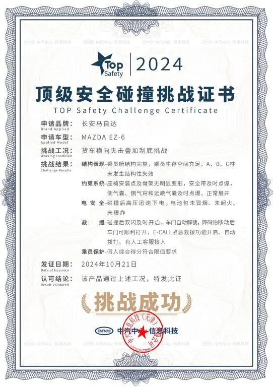 在本次挑战中,EZ-6的表现堪称安全典范:结构表现方面,其乘员舱结构完整,乘客生存空间充足,A、B、C柱未发生结构性失效;约束系统方面,座椅安装点及座椅骨架无明显变形,安全带及时点爆,侧气囊、侧气帘以及远端气囊及时点爆,正常展开,通过车内假人与气囊接触点可以看到,气囊对车内乘客保护及时、到位;电安全方面,EZ-6在碰撞后高压迅速下电,电池包未冒烟、未起火、未爆炸;救援方面,车辆双闪及时开启,E-Call紧急救援功能启动,自动拨打,有人工客服接入;乘员保护方面,车内假人综合得分符合限值要求。