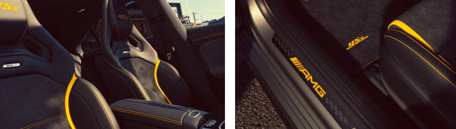 车内同样延续了黄色元素,终极版采用黑色 AMG 高性能座椅,由超纤绒面和奔驰 MB-Tex 合成皮革包裹。车内各处都有黄色缝线,前排头枕上绣有 “45 S” 标志。中控台有 “45 S 终极版” 字样,车门门槛处有发光的 AMG 徽章,脚垫上有 “45 S” 标识,纳帕皮革和微纤维材质的方向盘上也有更多黄色装饰。