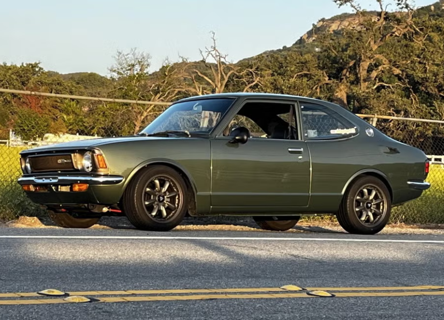 这台卡罗拉的底盘代号为 TE27,原本是 1972 年美国市场的 1600 轿跑版。经过改装后,它换上了双凸轮缸盖,配合轻微扩缸、全新活塞、轴承、活塞环以及双 Mikuni 化油器,动力提升很多。这项改装距今约 6 年,当时还同步更换了缸垫,并升级了 Koyorad 散热器以增强散热能力。