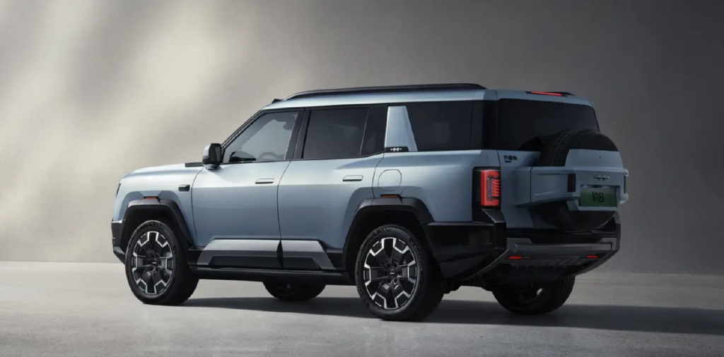 车尾部分,新车的尾部设计较为宽大扁平,配备了竖置形后尾灯组,全尺寸外挂式备胎以及与车头相呼应的宽体后包围,新车整体看上去非常的硬派。新车的长宽高分别为5195/1994/1875(含车顶行李架1905)mm,轴距为2920mm。