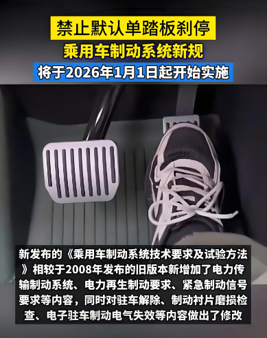 7 日,工信部发布了一个关于乘用车刹车系统的新国标,《乘用车制动系统技术要求及试验方法》,从 2026 年 1 月 1 日开始正式施行。