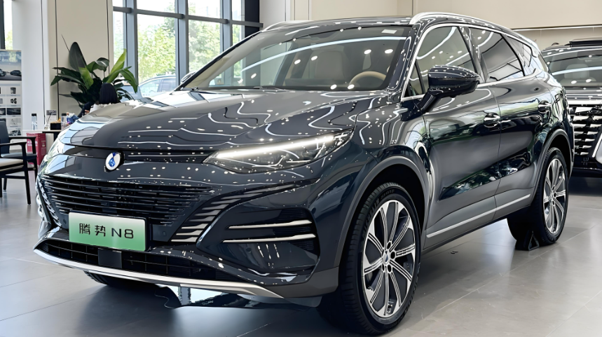 从曝光的照片来看,主要是车子侧面和后部的样子。腾势 N8L 的 B 柱、C 柱、D 柱都喷成了黑色,远远看去,车顶像悬浮着一样,挺有设计感。车门把手是隐藏式的,用手一碰就会自己弹出来,用着挺方便。加油口和充电口都设在车后面,加油充电都挺顺手。车尾灯的样式和腾势 N9 不太一样,但灯腔里面还是梯形的设计。车牌装在后包围上,不会挡住视线。而且车子颜色选择也不少,能满足不同人的喜好。
