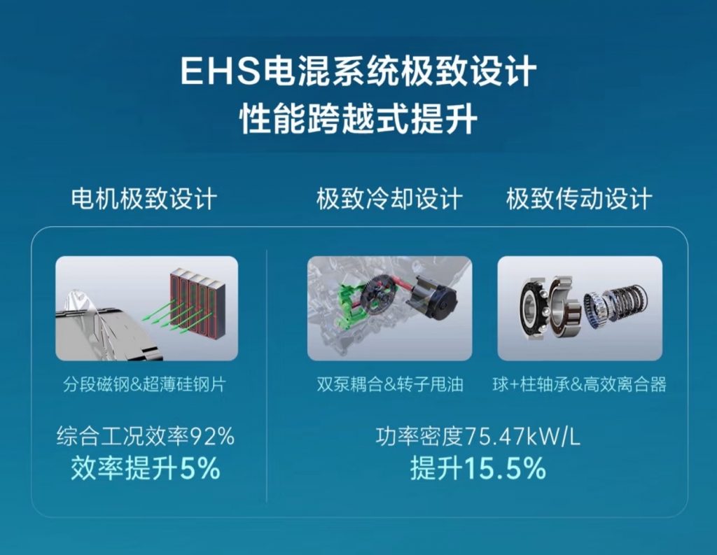 车子的电混系统(EHS)效率从 87.6% 提到了 92%,简单说就是电能和机械能转换时,浪费的能量更少了。就像以前转 100 圈只能用 87 圈的力,现在能用到 92 圈,劲儿更足还不费电。