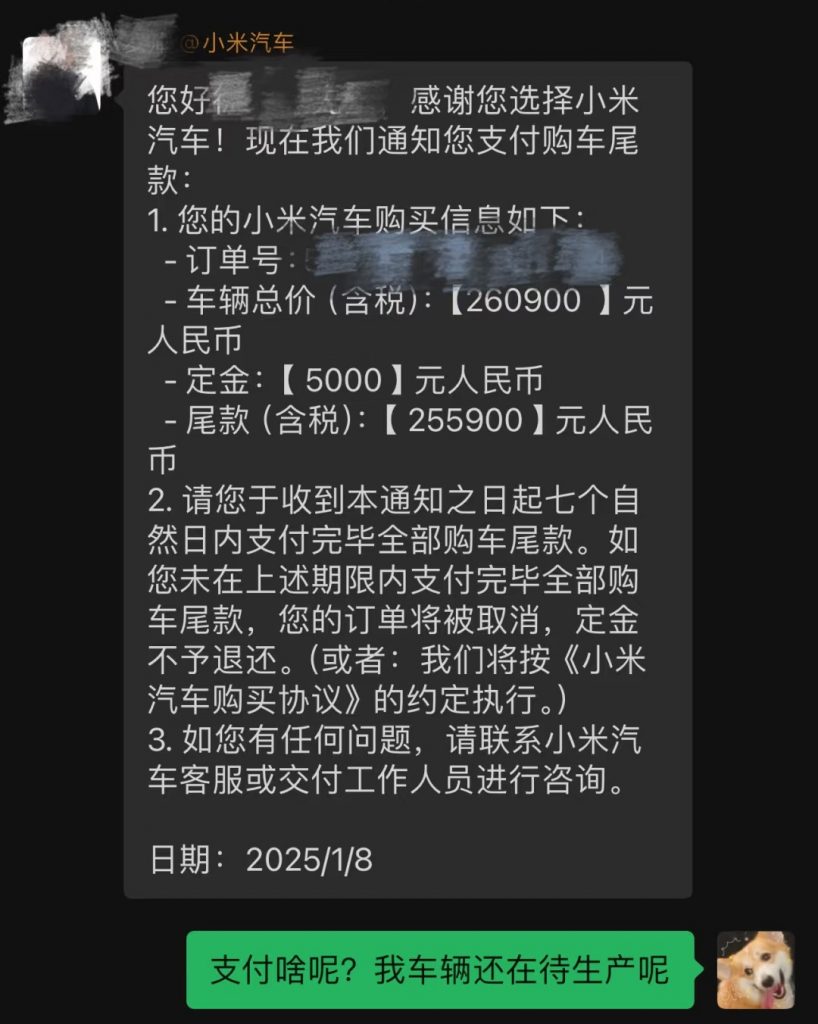 “车还没造好,小米就让 7 天内补尾款,不然定金作废。” 近日,有网友吐槽被小米汽车要求提前付尾款并晒出截图,引发关注。一位小米 SU7 Ultra 准车主称,7 月 30 日收到通知时,车辆显示还要 22-25 周交付,“我要求验车后付款,销售却说不付就取消订单、不退定金”,目前已请律师处理。