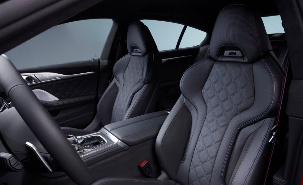 内饰同样满布 M 元素:M 运动座椅采用宝马钻石缝线黑色真皮与仿麂皮材质,柔软触感延伸至车顶内衬、仪表板及车门上沿;座椅、门板与安全带均以红蓝色三条纹缝线点缀,动感十足。中控台覆盖哑光碳纤维饰板,搭配玻璃换挡杆,既彰显性能基因,又凸显豪华质感。