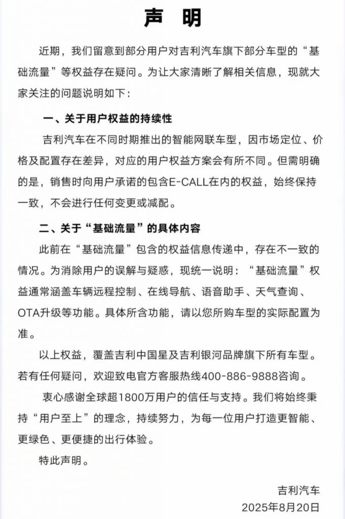 8 月 20 日,不少吉利车主最近在纠结车子 “基础流量” 到底包含啥权益,针对这个疑问,吉利汽车专门发了份声明给大家一个说法。