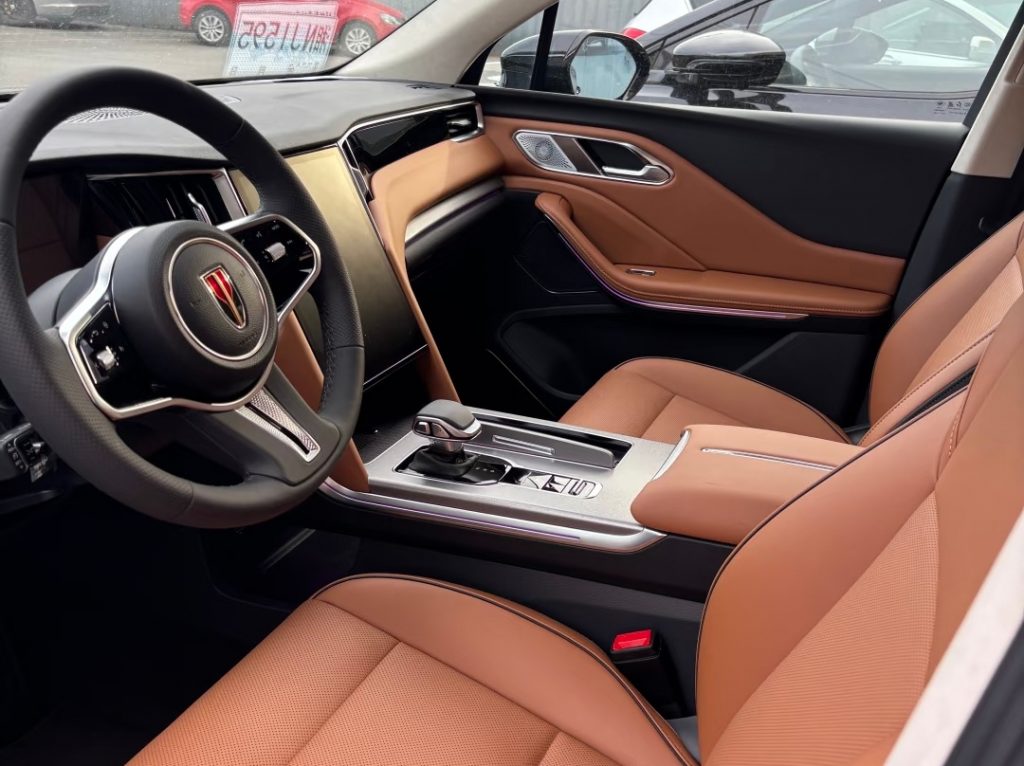 外观贴合国人审美:大尺寸直瀑式格栅如数字化水波纹,搭配宽镀铬饰条与红旗标,辨识度拉满;分体式大灯设计精巧,日行灯呈 “飘扬旗帜” 造型,矩阵式大灯照明出色;双腰线从车头延伸至车尾并微扬,隐藏式门把手将风阻系数压至 0.23;多辐轮毂灵感源自传统窗棂,235/55 R20 轮胎兼顾通过性与静谧性;贯穿式尾灯搭配 “飞檐” 亮条,既显宽体感又增强下压力,六种传统色系适配不同喜好。
