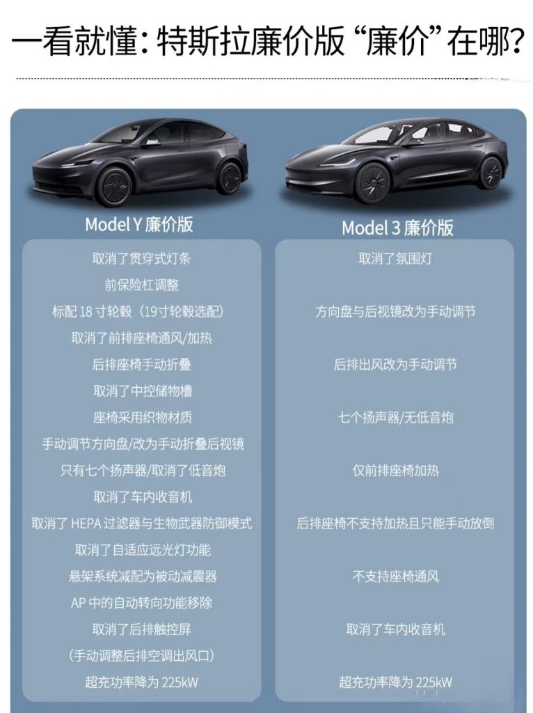 其实这事说穿了就是 “以配置换低价”。大家一边被 “特斯拉” 的牌子和降价幅度吸引,一边又怕配置少了会影响开车、坐车的舒服劲儿。所以到底值不值,先别着急下结论,得先看清它到底减了啥,又留了啥关键东西。