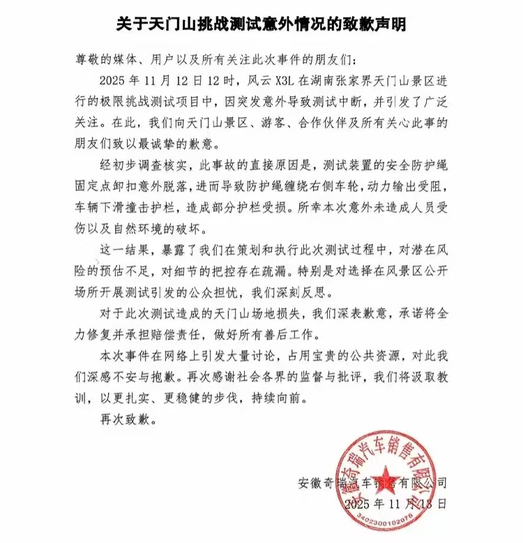 转天凌晨,奇瑞连夜发了致歉声明,一个劲儿道歉,还说会赔景区钱、修护栏。声明里解释,出事是因为固定安全绳的卡扣突然松了,绳子缠到右轮上,车没了动力才滑下去的。可网友们不买账:“这么大的测试,连个卡扣都没检查好?”