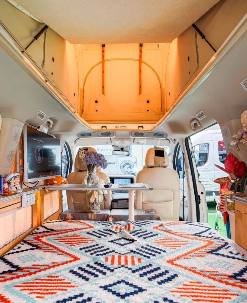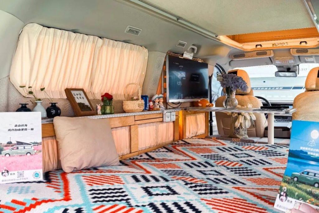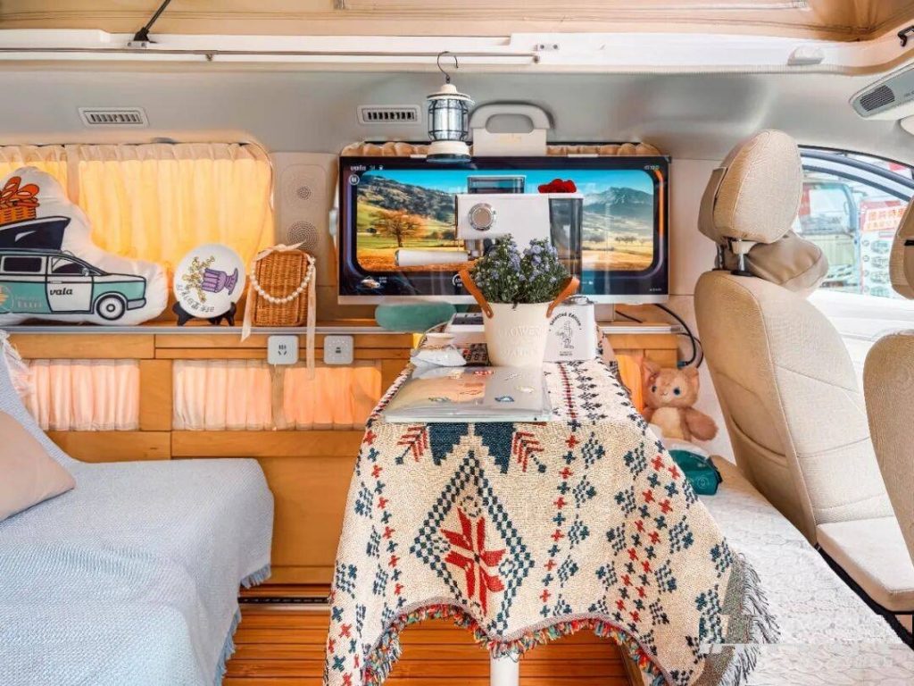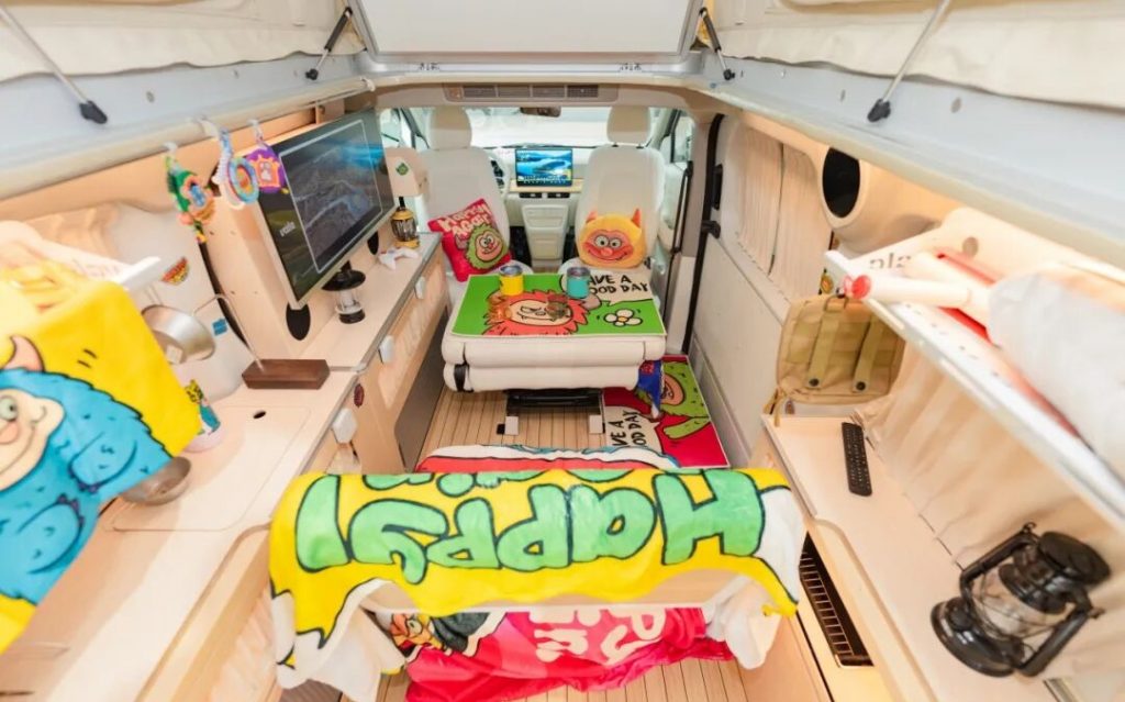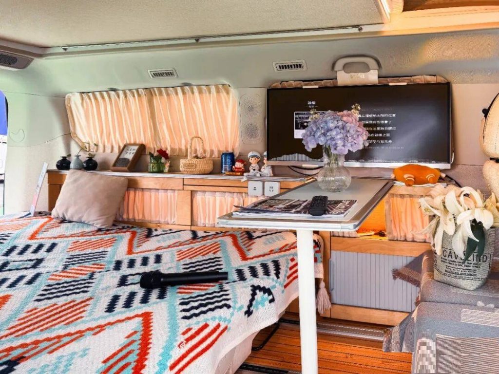 车内布局温馨,配备柔软床垫、折叠桌板、储物柜及插座,满足休息、用餐、娱乐等多种需求。后舱配备智能中控屏,可调节温度、湿度,并控制影音系统,如34英寸4K显示器、双低音炮和K歌系统,让旅途不再单调。升顶后,车内高度提升至约3米,站立无压力,通风更好,居住体验媲美“小型公寓”。