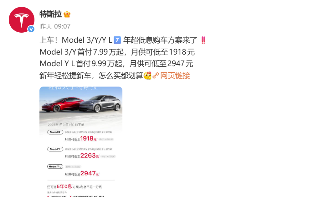 时间节点的选择也颇具策略性。春节前是中国汽车市场的传统销售旺季,消费者购车意愿强烈。特斯拉在1月6日推出政策,有效期至1月31日,精准瞄准这一节点,通过降低月供压力(如Model 3后轮驱动版首付7.99万元,月供2594元),刺激短期需求,冲刺第一季度销量。
