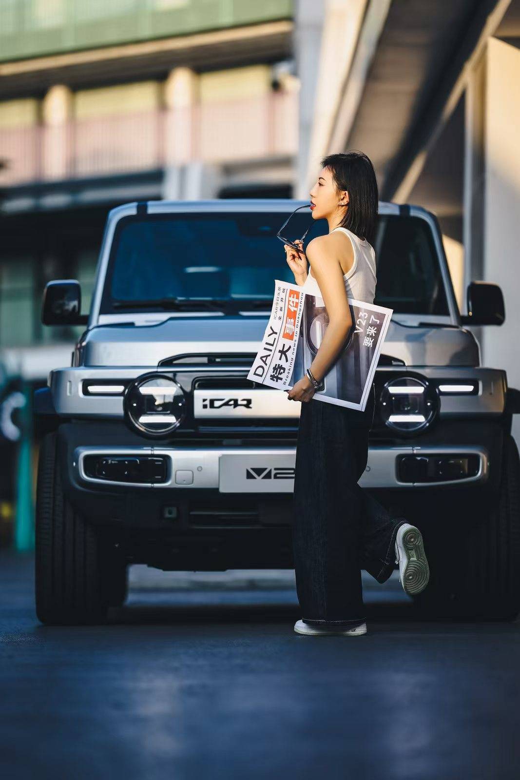 iCAR V23在外观设计上,巧妙地将经典越野风格与现代审美相结合,打造出了一款既复古又时尚的SUV车型。车身线条简洁而有力,前脸部分采用了粗厚的车头下部进气口和变大的两侧进气槽,赋予整车强烈的力量感。致敬经典的圆形大灯设计,不仅提升了车辆的辨识度,还增添了几分复古情怀。而嵌套式“小书包”设计元素,更是以创新手法重新诠释了经典,使得iCAR V23在新能源汽车设计趋同的今天独树一帜。