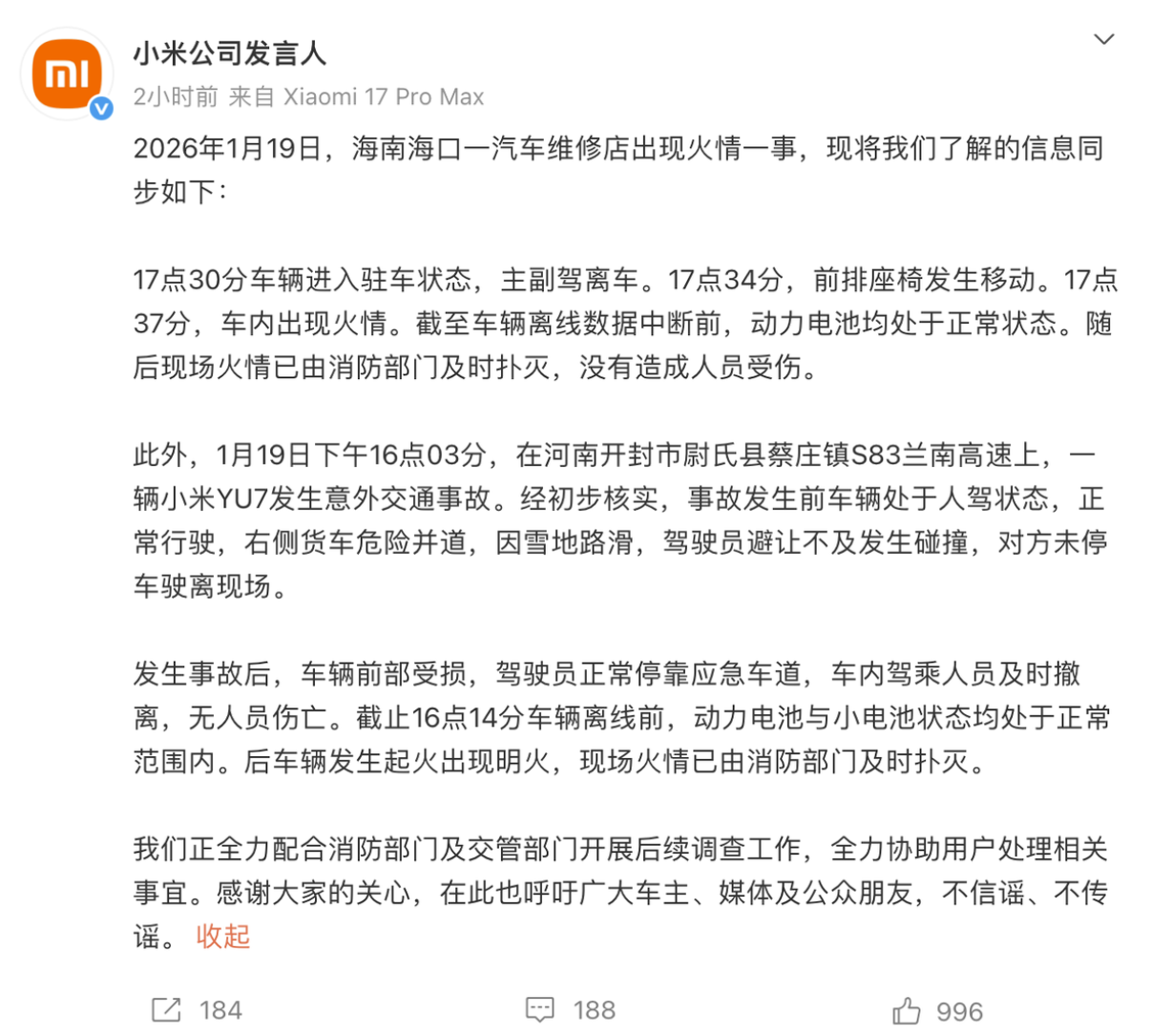 1月19日,小米汽车在海南海口和河南开封分别出现两起涉及车内起火的事件。1月20日,小米汽车通过官方账号小米公司发言人发布情况说明,对两起事件的时间节点和现场情况作出详细还原,并提供了系统离线前的监测数据。