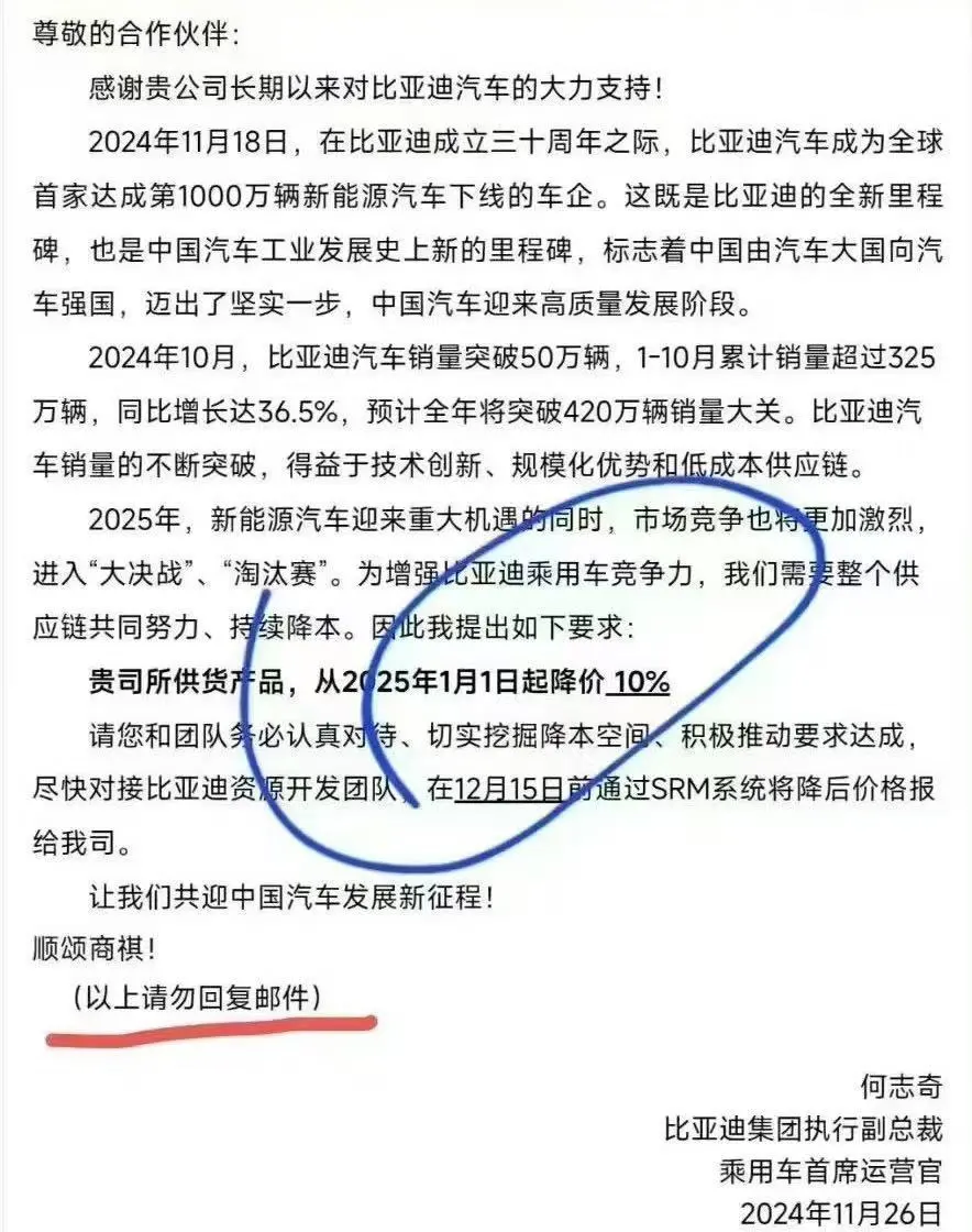 网传邮件提到,比亚迪汽车销量不断突破,预计全年将突破420万辆销量大关,得益于技术创新、规模化优势和低成本供应链。2025年市场竞争将更加激烈,进入“大决战”“淘汰赛”。为增强比亚迪乘用车竞争力,比亚迪需要整个供应链共同努力、持续降本。因此,比亚迪对供应商所供货产品提出要求:从2025年1月1日起降价10%。