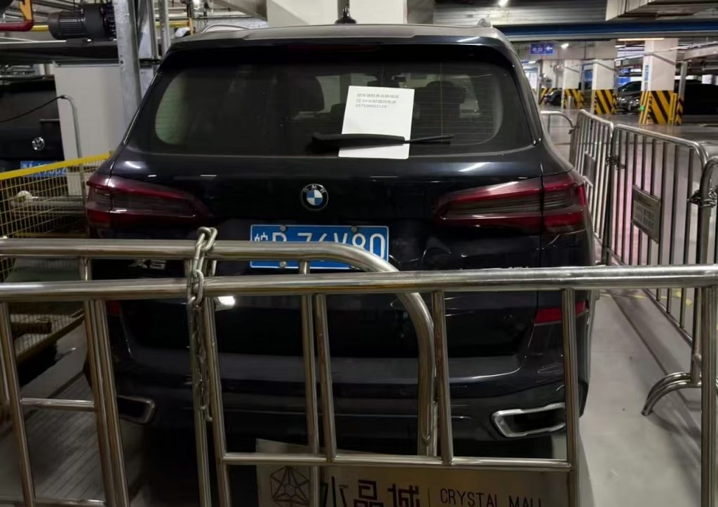 这事是2月2号网友在社交平台爆出来的,现场图片看得人直咋舌。这辆安徽牌照的宝马,停在商场地下B3层靠近出口的位置,四周被金属围栏围得严严实实,后窗上贴的告示写得明明白白:“移车请联系水晶城消控24小时值班电话”,字里行间全是商场的无奈。