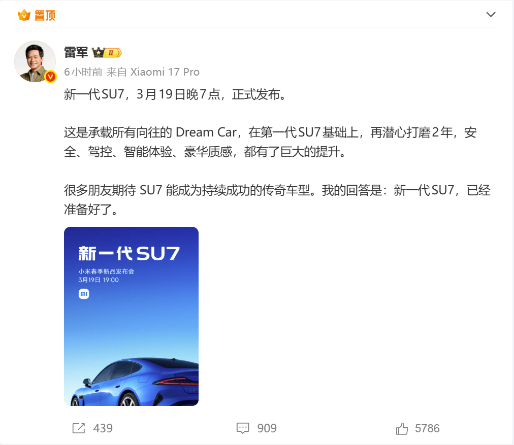 今天,小米雷军方面对外公布,新一代SU7新品发布会将于3月19日晚19点举行。这一消息公布后,迅速引发大量关注,不少用户和行业观察者纷纷将目光聚焦到这款即将登场的新车型上。