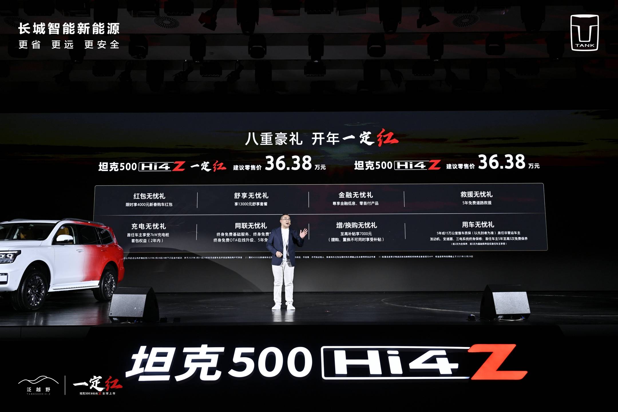 坦克500 Hi4-Z的售价为36.38万元,同时推出的还有坦克500 Hi4-Z一定红特别版。在2月28日之前下订,消费者可以享受到八大购车权益,包括4000元新春购车红包、价值13000元的舒享套餐,以及金融、增换购、网联、充电、用车、救援六大无忧礼遇。