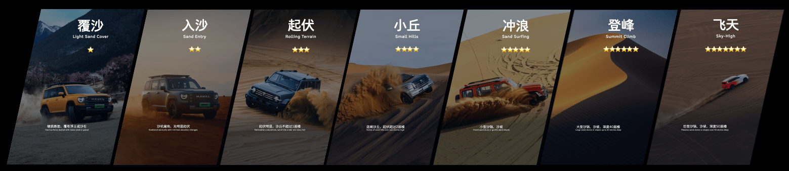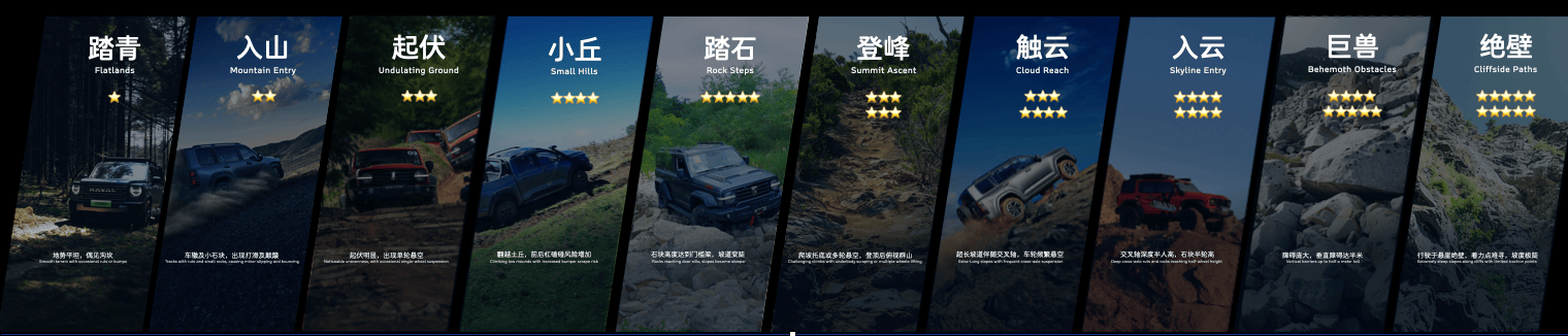 长城汽车将雪地、山地、沙地、泥地这四大典型越野场景,进行归纳细分,从1级到最高10级,越野难度与风险程度依次递增。用户不仅要懂自己的车,也要了解自己要去的场地,才能更安全。