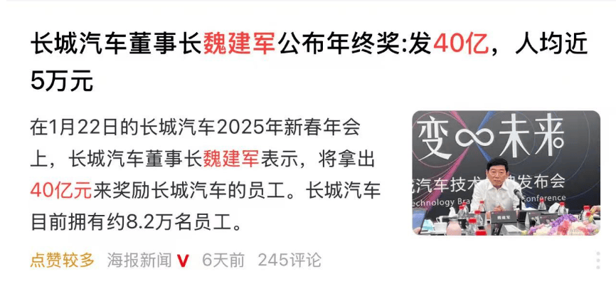 另外,长城的魏总更是非常大气,在裁员、降薪、倒闭的行业大背景下,直接拿出了40亿,给大家发年终奖。