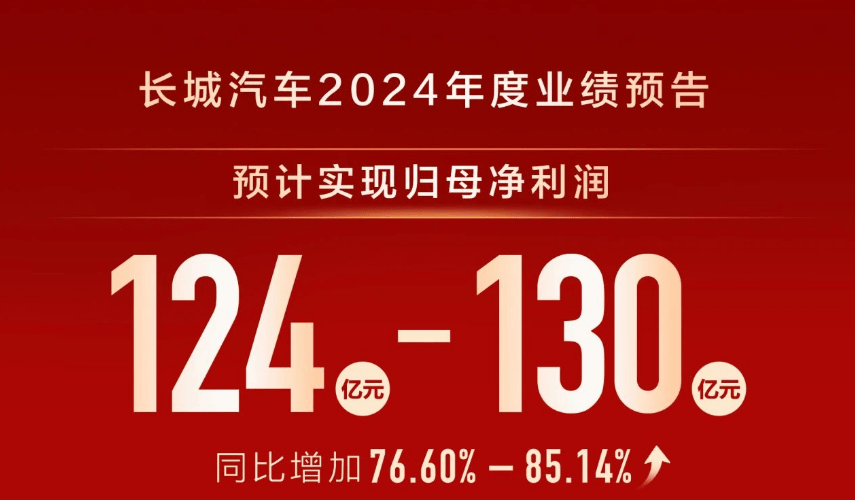 事实上,长城反而是赚爆了。不久前,长城发布了2024年的财报预告,预计净利润124-130亿,同比大涨了76.6%-85.14%。