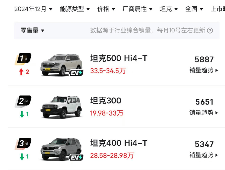 不过,2024年长城利润大涨更应该归功于坦克400 Hi4-T、和坦克500 Hi4-T。这两款车以30万级的售价,12月份合计销量超过1万辆。