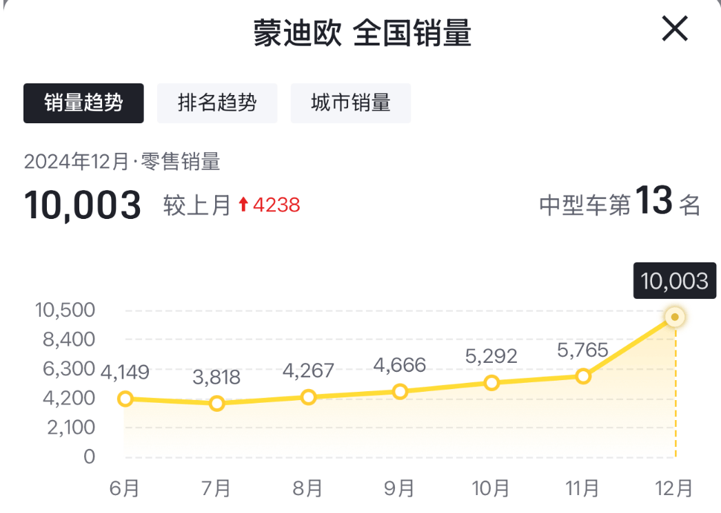随着后来价格下调、优惠加大,在去年9月份2025款上市后,蒙迪欧的销量又有了起色。目前2025款起售价14.98万,优惠后裸车价不到13万,12月的销量成功破万,达到10003辆。